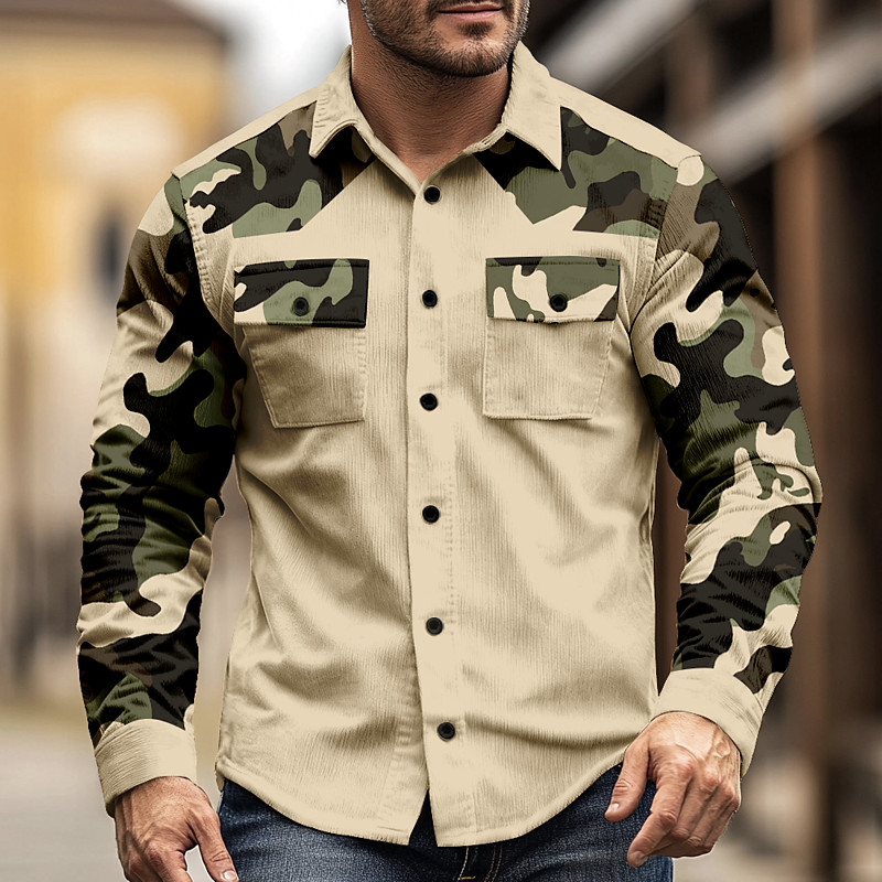 Men's Camo Camouflage Corduroy Shirt Western Shirt Shirt Jacket Long Sleeve Vintage Retro Outdoor WorkWear Fall Winter Turndown 3D Print Cowboy Shirts Jacket with Flap Pockets Taupe Gray Dark Green
