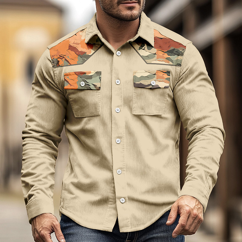 Men's Camo Camouflage Corduroy Shirt Western Shirt Shirt Jacket Long Sleeve Vintage Retro Outdoor WorkWear Fall Winter Turndown 3D Print Cowboy Shirts Jacket with Flap Pockets Orange Green Khaki