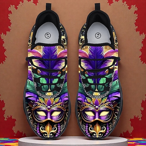 Scarpe slip-on da uomo per Mardi Gras in viola e verde con motivo di maschera di piuma – Calzature comode e alla moda per Carnevale parate e festival