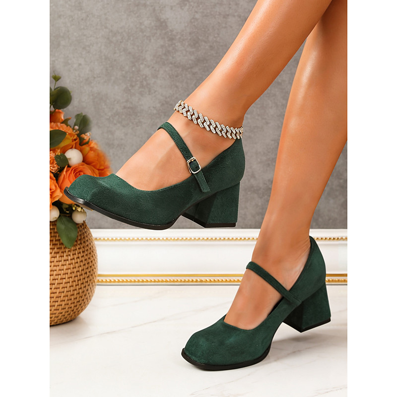 Women's Elegant Green Suede Single-Strap Block Heel Pumps Comfortable Square Toe Mary Janes for Office and Daily Wear