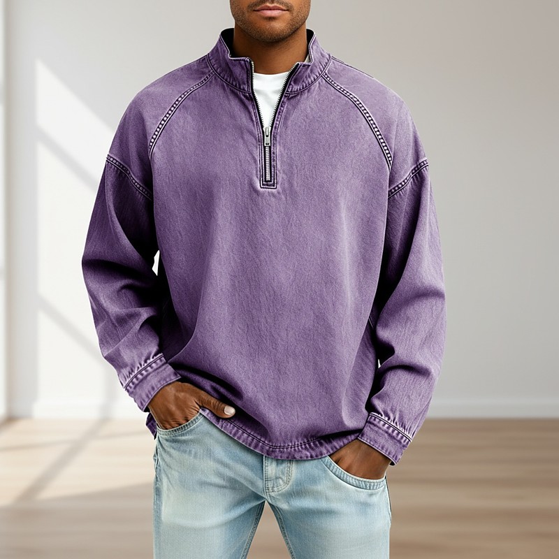 Men's 100% Cotton Acid Wash Shirt Tee Top Long Sleeve Stand Collar Spring Fall Fall Winter Plain Vintage Streetwear Casual Zip Up Basic Casual Home Street Black Pink Light Green Top Tee for Men