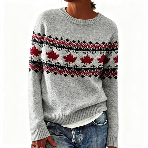 Damen Weihnachtspullover Fair Isle Pullover Pullover Streetwear Lässig Geometrisch Rundhalsausschnitt Gestrickt Druck Langarm Normale Oberteile Stricken Täglich Ferien Ausgehen Rote Braun Herbst