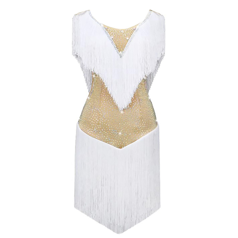Latin Dance Dress Rhinestone Tassel Splicing Women's Performance Training Sleeveless Chinlon Mesh Spandex
