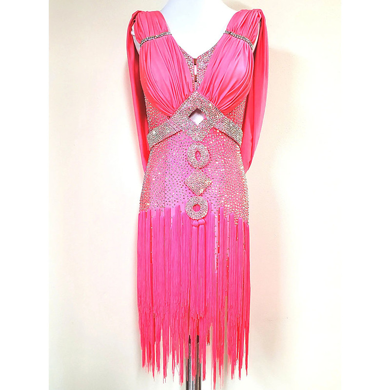 Women's Pink Latin Dance Dress with Crystal Rhinestone Detail, Fringed Skirt, and Elegant Draped Sleeves for Salsa, Tango, and Performance Wear
