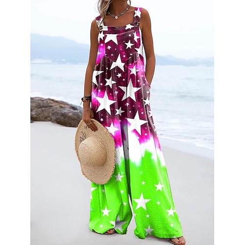 Unabhängigkeitstag Patriotic Damen Latzhosen Aktiv Floral Ärmellos Ärmellos Weite Beine Quadrat-Ausschnitt Pocket Knöpfe Täglich Strand Lockere Passform Rot Lila Orange Sommer