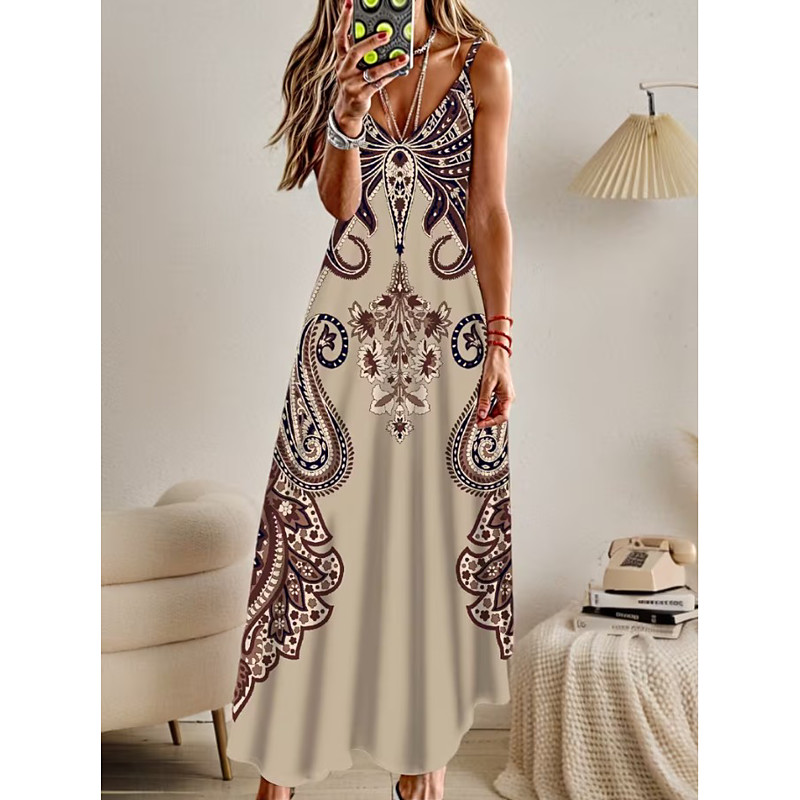 Women's Maxi Dress Sheath Dress Party Casual Boho Daily Date Going out Regular Fit Graphic Geometric Paisley Long Sleeve V Neck Blue Black Light Brown Purple Spring Fall Winter Autumn