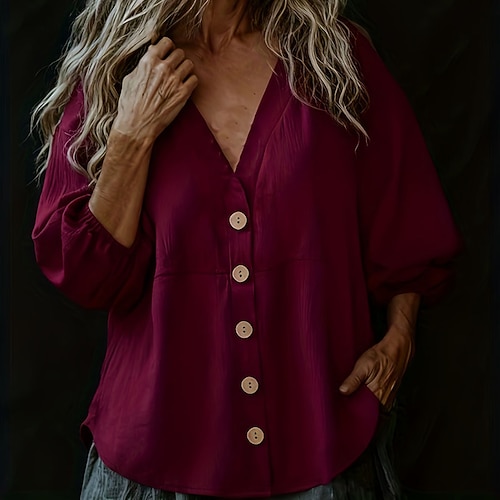 Per donna Camicie di cotone e lino Blusa Semplice Elegante Vintage Manica Lunga Scollo a V Top Regolari Quotidiano Ferie Uscire Bottoni Vino Estate Primavera Autunno