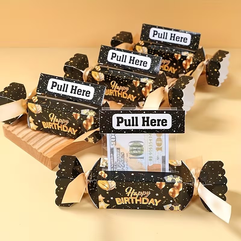 4 Pack Black and Gold Pull-Out Birthday Gift Boxes, Cash Surprise Gift Packaging, Ideal for Home Decor, Adult Birthday Celebrations, Anniversary Parties and Event Gifts