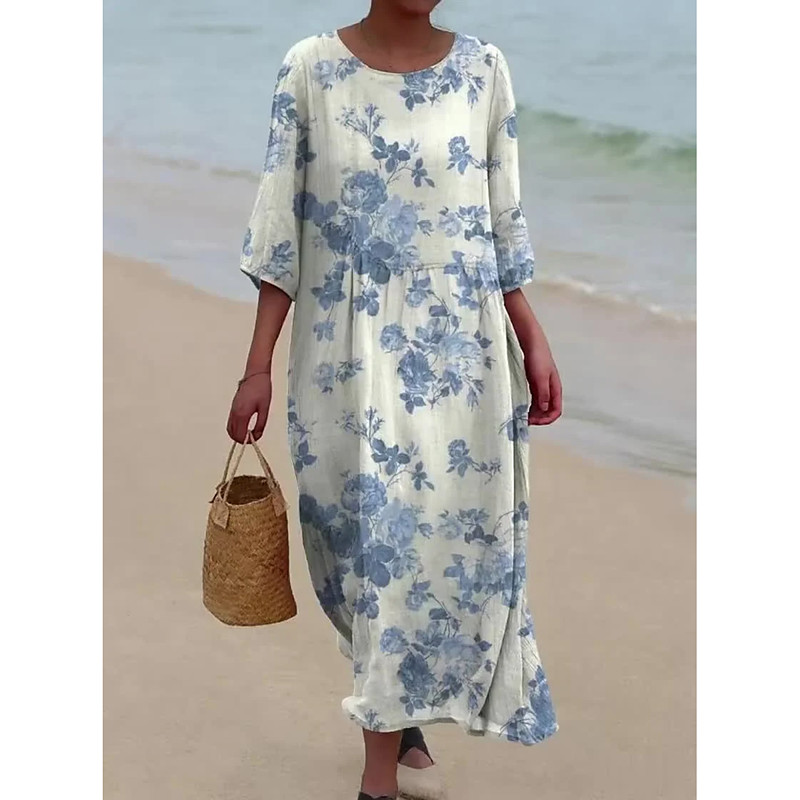 Women's Maxi Dress Kaftan 3/4 Length Sleeve Crew Neck Casual Shift Dress Dress Boho Daily Holiday Date Floral Graphic Yellow Pink Blue Green Spring Fall
