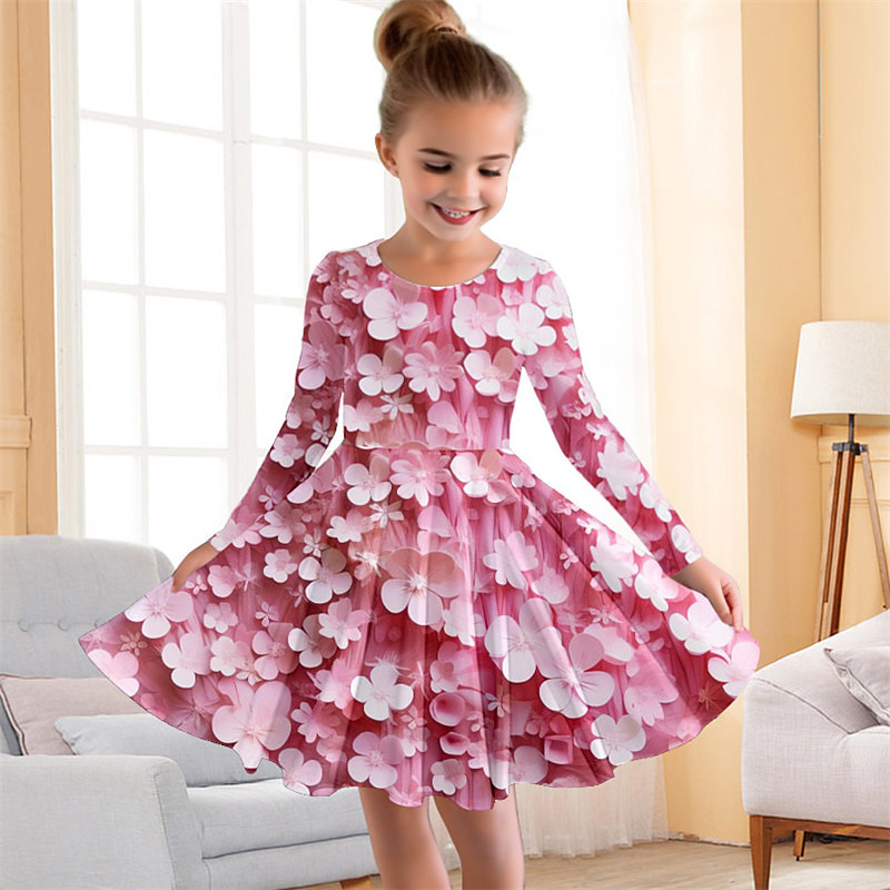 Easter Carnival Girls' 3D Floral Dress Long Sleeve 3D Print Spring Fall Vacation Sports Outdoor Daily Cute Casual Beautiful Kids 3-12 Years Casual Dress A Line Dress Above Knee Regular Fit