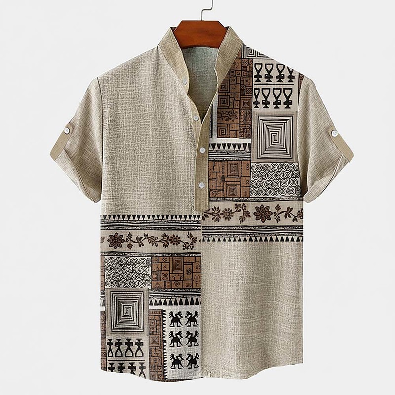 Men's Geometric Pattern Tribal Ethnic Shirt Button Down Shirt Short Sleeve Vintage Retro Holiday Casual Daily Summer Spring Standing Collar Henley Collar 3D Print Linen Like Shirt Dark Khaki