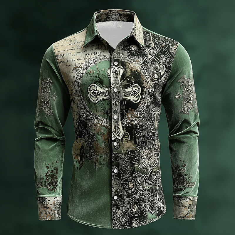 St. Patrick's Day Men's Celtic Cross Intricate Floral Shirt Button Up Shirt Long Sleeve Vintage Retro Holiday Spring Fall Turndown 3D Print Linen Like Shirt Light Green Green