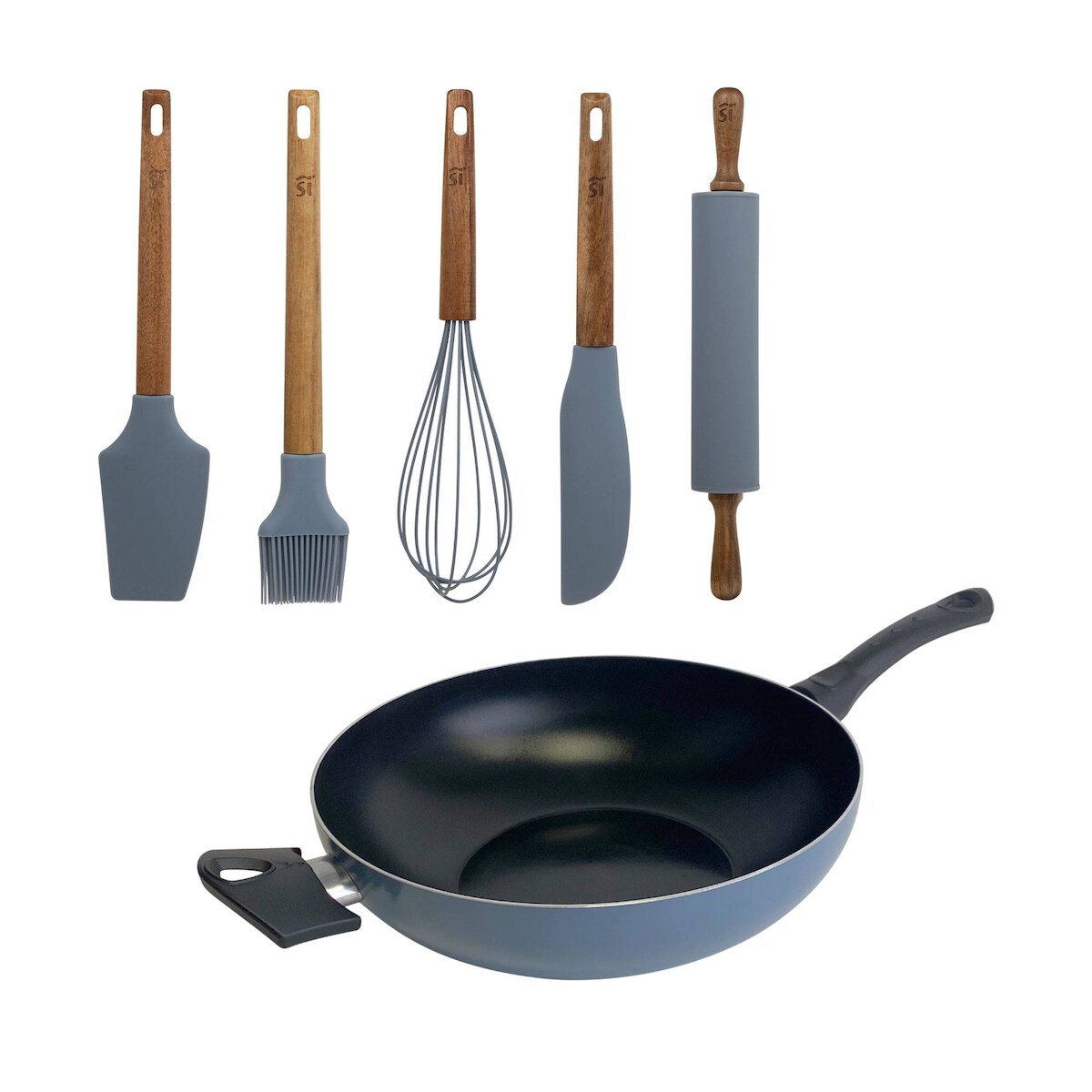 San Ignacio Noia - Wok Ø30cm aus gepresstem Aluminium, blaue Farbe, mit 5-teiligem Set aus Silikon- und Holzutensilien