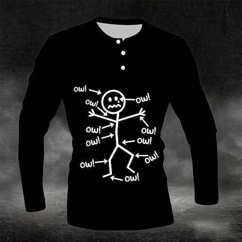 Herren Langarm-Henley-Shirt Lustiges Ow Strichmännchen-Grafik-T-Shirt - Aches Pains Lifestyle-Humor