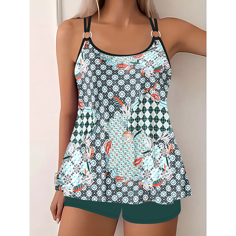 Women's Tankini 2 Piece Swimsuit Shorts Tummy Control High Waist Slim Backless Vacation Beach Wear Ombre Floral U Neck Sleeveless Bathing Suits