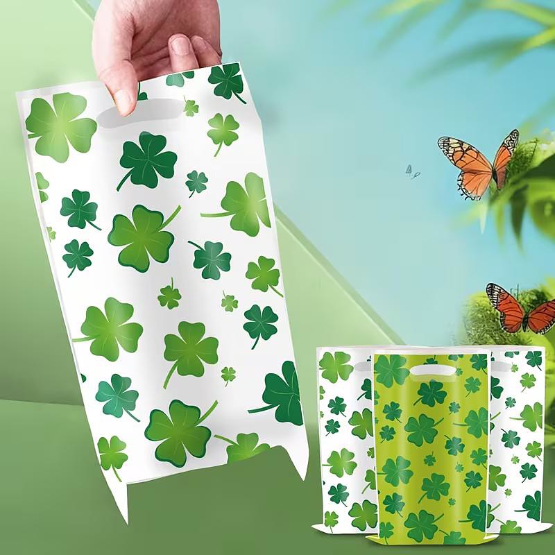 10-Pack St. Patrick's Day Plastic Gift Bags with Clover Shamrock Design - PET/PBT Goodie Bags Suitable for Birthday Parties Irish-Themed Events Treats