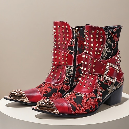 stivaletti da uomo in vera pelle di vacchetta con cerniera rossa e dettagli floreali dorati: eleganti stivali punk western per festival e spettacoli