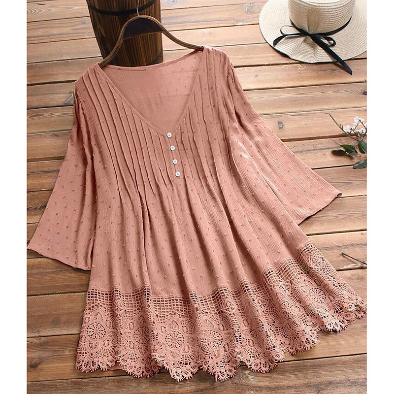 Women's Blouse Solid Color Stylish Basic Casual 3/4 Length Sleeve V Neck Regular Tops Daily Ruched Lace Trim Black White Pink Navy Blue Green Summer Spring
