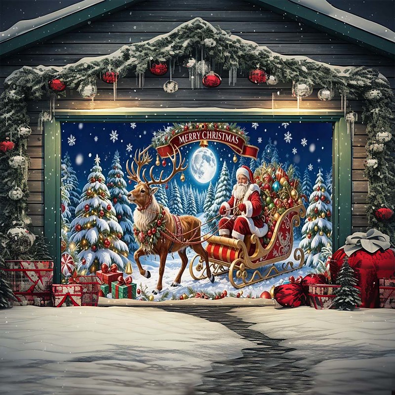 Christmas Scenic Garage Door Cover – Festive Holiday Decoration, Christmas Landscape Snow Winter Santa Garage Curtain for Home Exterior