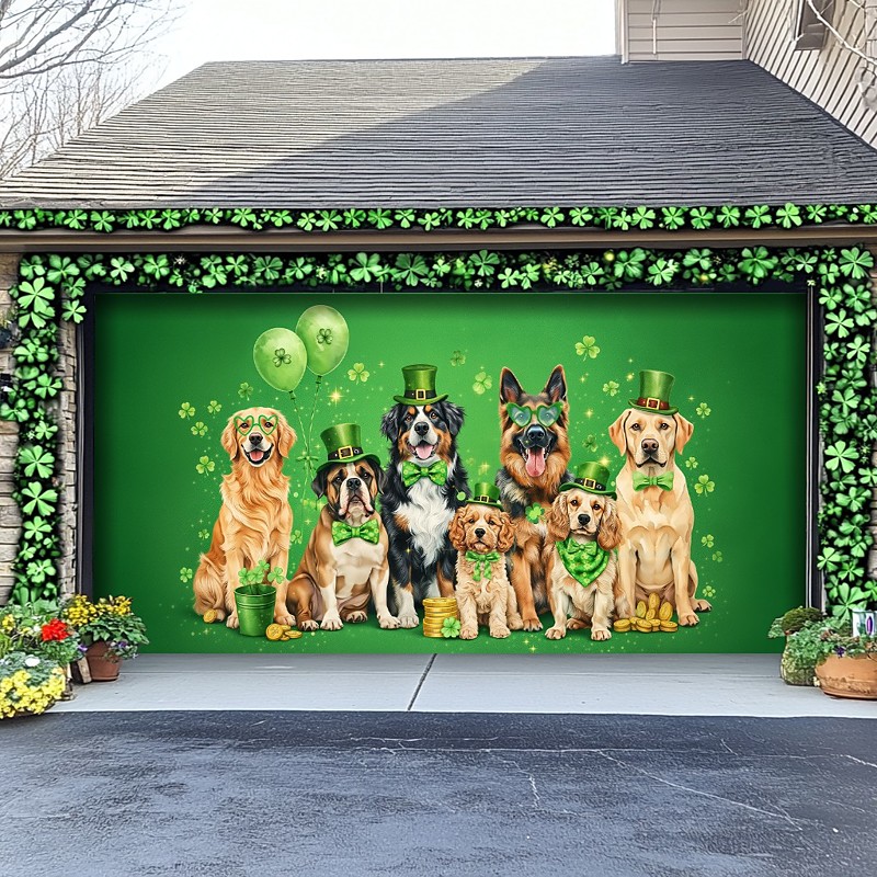 St. Patrick's Day Garage Door Cover, Adorable Dogs in Leprechaun Hats with Clovers, Festive Outdoor Decoration for St. Patrick's Day Celebration.