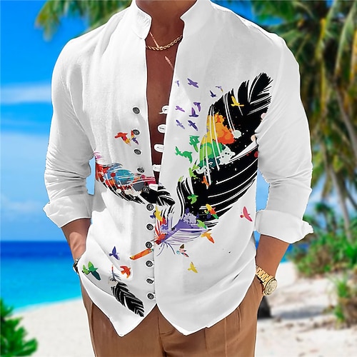 Per uomo Uccello Piuma Camicia Camicia con Bottoni Manica Lunga Moda Designer Casual All'aperto Vacanza Quotidiano Autunno Primavera Estate Collo alla coreana Stampato Nero Rosso Blu Viola Verde