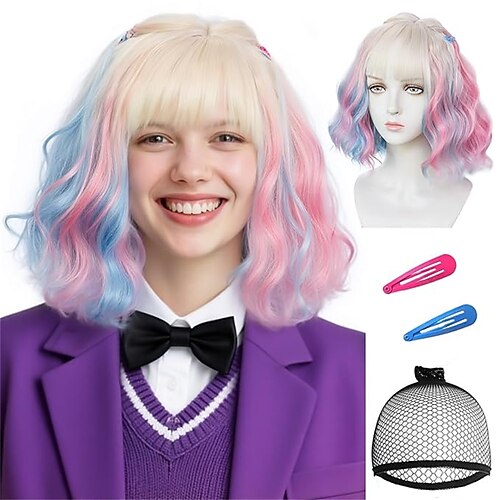 Parrucca di Carnevale 2026 Biondo Rosa Blu Riccio Ciocca Lunghezza media Parrucca sintetica da festival Martedì grasso Parata Capelli per costumi da cosplay per Da donna