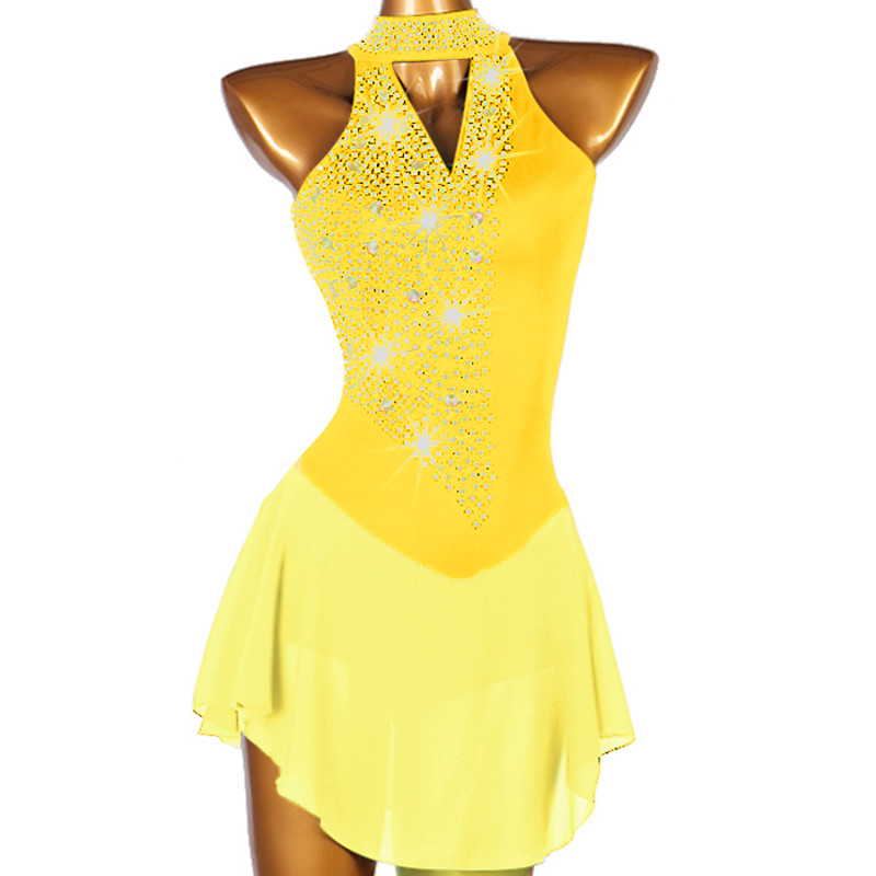 Figure Skating Dress Women's Girls' Ice Skating Dress Blue Black Yellow Patchwork Open Back Mesh Spandex High Elasticity Training Practice Professional Skating Wear Classic Crystal / Rhinestone Long