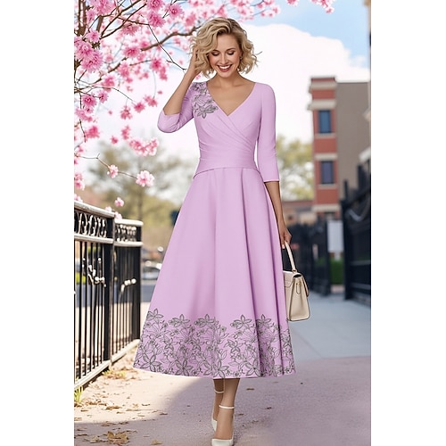 Linea ad A Lunghezza Tè Vestito da Festa Abito da Cocktail Abito da invitata a nozze Abito da cerimonia per signora Manica 3/4 Scollo a V Elegante Festa in giardino Matrimonio Formale Raso Crepe