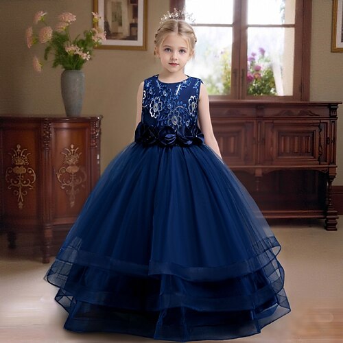 Blumenmädchenkleid Mädchen Formelle Kleidung Hochzeitskleidung Party Hochzeit Formell Elegant Mode Schön Netz Blumen Ärmellos Rundhalsausschnitt Grau Marineblau Ab 4 Jahren