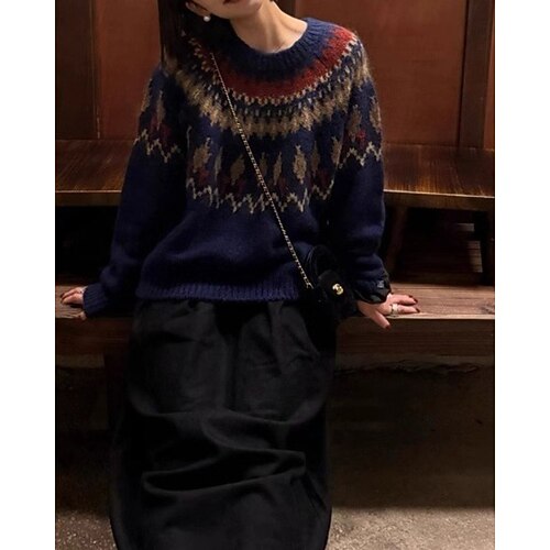 Damen Weihnachtspullover Fair Isle Pullover Pullover Vintage Mode Streetwear Grafik Rundhalsausschnitt Gestrickt Druck Langarm Normale Oberteile Stricken Täglich Ferien Ausgehen Blau Schwarz Herbst
