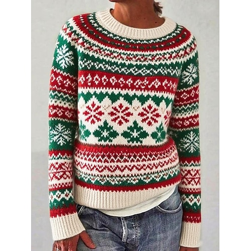 Damen Weihnachtspullover Fair Isle Pullover Pullover Fair Isle Sweater Streetwear Lässig Blumen Rundhalsausschnitt Gestrickt Druck Langarm Normale Oberteile Stricken Weihnachten Täglich Ausgehen