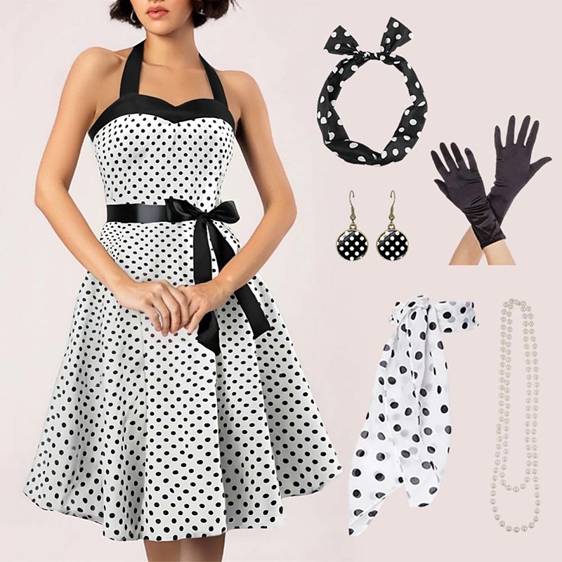 Outfit Vintage retro anni '50 Grease Costume Rockabilly Petticoat Gonna a cerchio Vestito A-Line Tutu Vestito a pois Festa Elegante Costume da donna Festa Serale Mascherata Abito orecchini Accessori