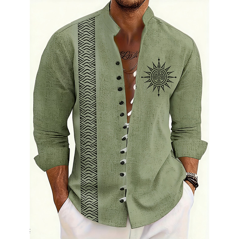 Men's Sun Ethnic Indian Culture Shirt Button Up Shirt Stand Collar Shirt Short Sleeves Vintage Retro Vacation Daily Summer Spring Grandad Collar Mandarin Collar 3D Print Linen Like Shirt Blue Green