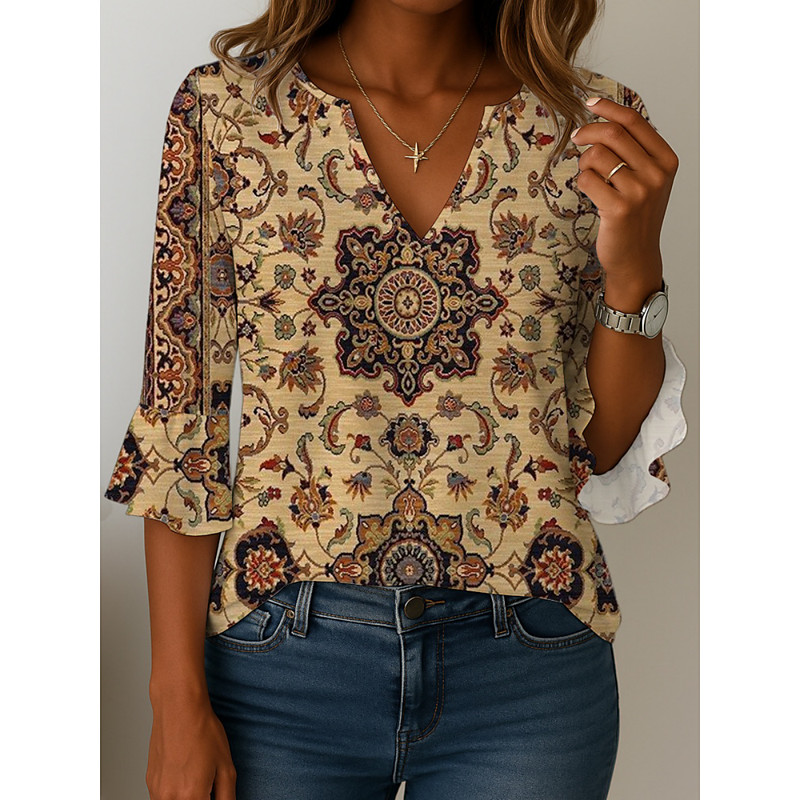 Women's Blouse Paisley Retro Vintage Ethnic 3/4 Length Sleeve V Neck Regular Tops Daily Holiday Ruffle Print Black Blue Lavender Purple Green Summer