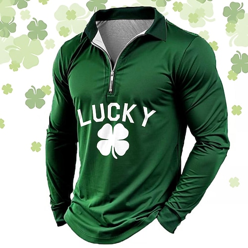 San Patrizio Per uomo Testo Polo con zip Manica Lunga Magliette polo Bavero Casual All'aperto Abito da festa Stampa 3D Primavera Autunno Nero Blu marino Verde