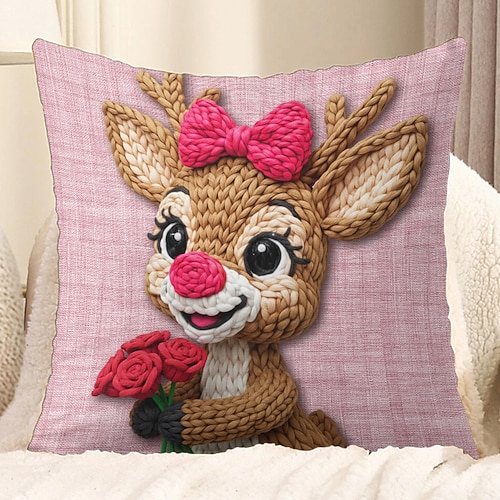 Federa per cuscino rosa con stampa piatta 2D per San Valentino con cervo che indossa un fiocco e tiene delle rose, motivo che fa l'occhiolino, graziosa federa decorativa, regalo perfetto per San