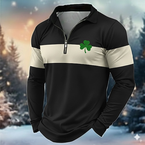 San Patrizio Per uomo Quadrifoglio Polo con zip Manica Lunga Magliette polo Bavero Casual All'aperto Abito da festa Stampa 3D Primavera Autunno Nero Verde scuro Verde