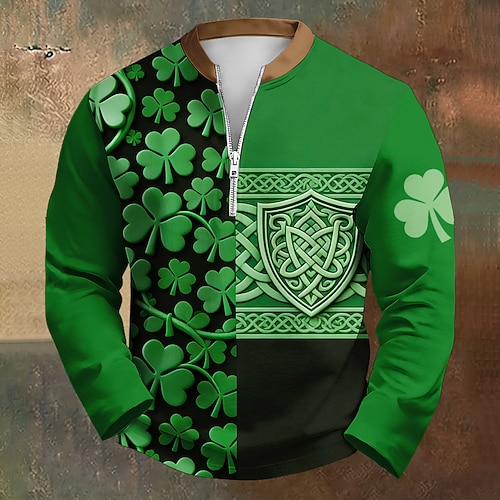 San Patrizio Per uomo Quadrifoglio Polo Manica Lunga Collo ripiegato Tempo libero Athleisure Casual Quotidiano Festival Cerniera Stampa 3D Primavera Verde