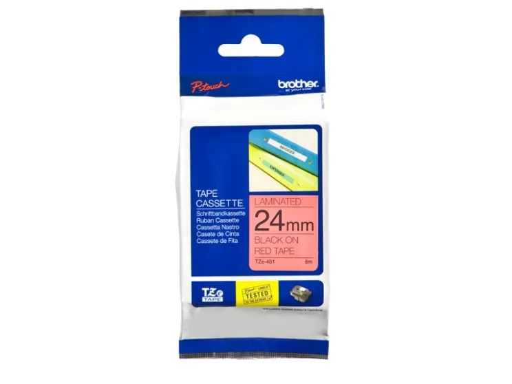 Brother TZe-451 - Standardklebemiddel - svart på rødt - Rull (2,4 cm x 8 m) 1 kassett(er) laminert teip - for Brother PT-D600 P-Touch PT-2430, 3600, 7600, 9800, D800, E500, E550, H500, P750, P900