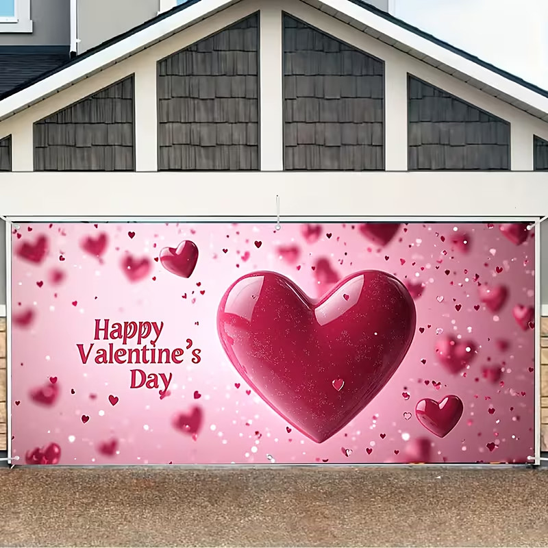 Valentine's Day Garage Door Cover: 2D Flat Print Large Glossy Heart Design with Happy Valentine's Day Greeting, Perfect Decoration