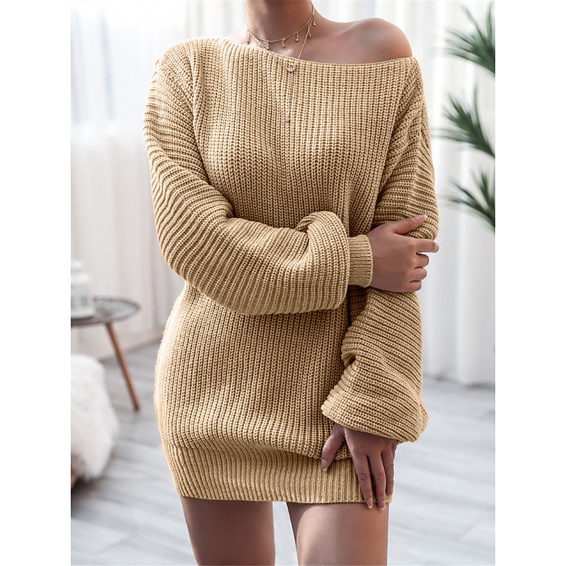 Women's Sweater Dress Casual Soft Solid Color Ribbed Crew Neck Pocket Knitted Cold Shoulder Long Sleeve Long Tops Knit Outdoor Daily Weekend White Pink Fall Winter