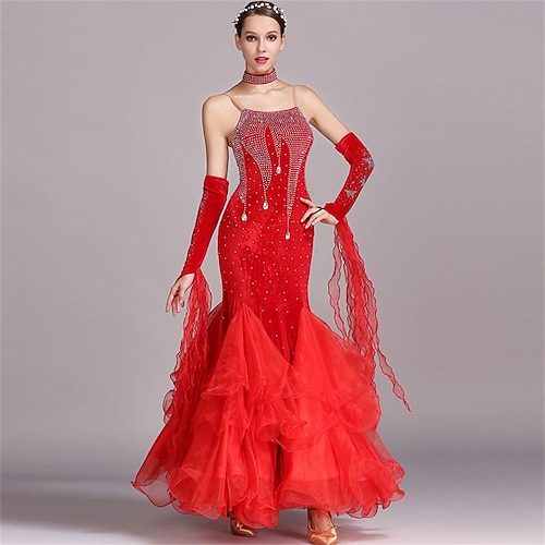 abito da ballo da sala da donna, verde smeraldo, in organza di velluto a rete con strass, a strati, per tango, valzer, foxtrot, competizione