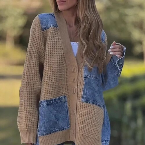 Per donna Felpa Cardigan Streetwear Casual Tinta unica Scollo a V Patchwork Tasca Bottoni Manica Lunga Top Regolari Maglia Quotidiano Ferie Uscire Nero Bianco Autunno Inverno