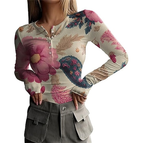 Per donna Maglietta Tinta unica Floreale Grafico Elegante Moda Carino Manica Lunga Girocollo Top Regolari Quotidiano Uscire Weekend Patchwork Bottoni Blu Bianco Giallo Rosa Rosso Primavera Autunno