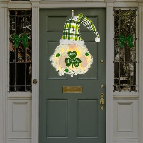 ghirlanda irlandese di San Patrizio con luci a LED, trifoglio, bambola senza volto, gnomo ornamentale, 60x30 cm, veranda interna/esterna, parete, soggiorno, sala da pranzo, decorazione per feste