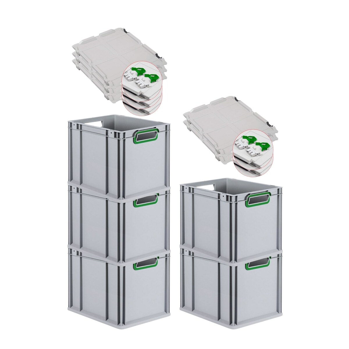 PROREGAL 5x Eurobox NextGen Color mit Scharnierdeckel & Verschlüssen | HxBxT 22x30x40cm | 30 Liter | Griffe grün offen | Glatter Boden