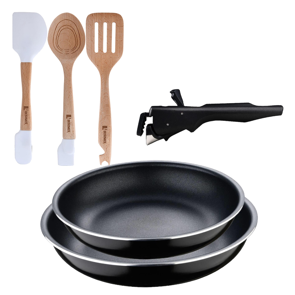 BERGNER - Set aus 2 Pfannen Ø22/26 cm gepresstes Aluminium mit abnehmbarem Griff mit Set aus 3 Küchenutensilien aus Silikon und Holz