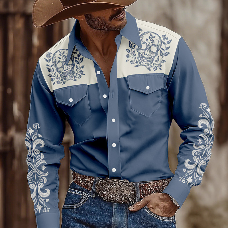Men's Skull Day of the Dead Flowers Shirt Western Shirt Cowboy Shirt Long Sleeve Vintage Retro Outdoor Holiday WorkWear Spring Fall Turndown Front Two Pockets Linen Like Shirt Button Up Shirts Blue