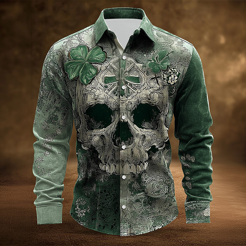 St. Patrick's Day Men's Skull Four Leaf Clover Shamrock Shirt Button Up Shirt Long Sleeve Vintage Retro Holiday Spring Fall Turndown 3D Print Linen Like Shirt Green 1# Green