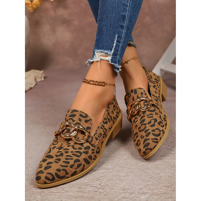 Leopard Print Faux Suede Loafers for Women – Chic Slip-On Shoes with Gold Chain Detail and Block Heel, Stylish Casual Footwear